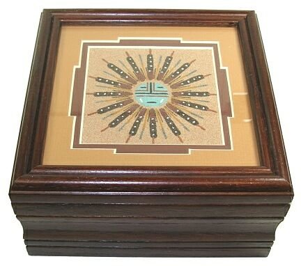 Sun ~ Navajo Sand Painting Box Matted and Framed with a Glass Top ~ These sand paintings are done completely by hand. On the back of each piece is a card with the artists name and picture. The Navajo people believe the universe to be delicately balanced. Only man can upset it causing disaster or illness. When this happens a medicine man must restore the natural balance. Balance is restored by healing the offender with chants herbs prayers songs and sand paintings. This piece measures approximately 7 x 7 x 3.75 Inch. This sand painting is the work of Lehi Benally a Navajo Indian. Handcrafted in New Mexico.