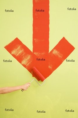 Wallmonkeys Peel and Stick Wall Graphic - Caucasian Female Hand Painting Red Downwards Arrow on Wall. - 24"H x 16"W Feature
