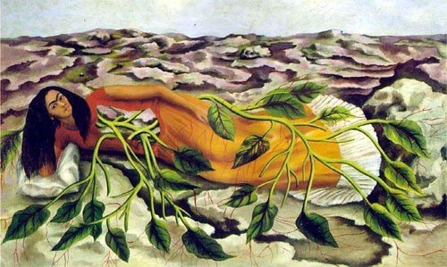 Roots: Frida Kahlo: Hand-painted art oil reproduction on canvas. Frida Kahlo painted Roots in the year 1943. Roots, oil painting, depicts the artist Kahlo lying on her side. She is dressed in complimentary yellow in relation to the green vegetation growing about her. Her long black hair hangs loosely from her head, her lips traditionally pursed beneath a heavy brow of black. Celebreated as a Surrealist for her ability to transcend the ornery limitations of everyday life and create a dreamscape for the viewer on the canvas, Kahlo’s self portraits are arguably not only the most dramatic but the most revealing in art history. In this example, Kahlo’s body is deprived of separation from the earth, the vines growing into her but also revealing through the window in her midsection that she is as simple as the vine itself. There is no substance to her in this painting beyond her life as a plant and this is what makes Roots so tremendously surreal. Yet, the artist seems at home here. Despite her stern expression she does not appear to be struggling and one could say that it is the most natural and serene position that Kahlo can be seen depicted in. Roots appears to show no sign of struggling or strife but instead shows Kahlo as one with nature, interwoven with the vegetation and existing in a daytime field peacefully and without any sign of torment.